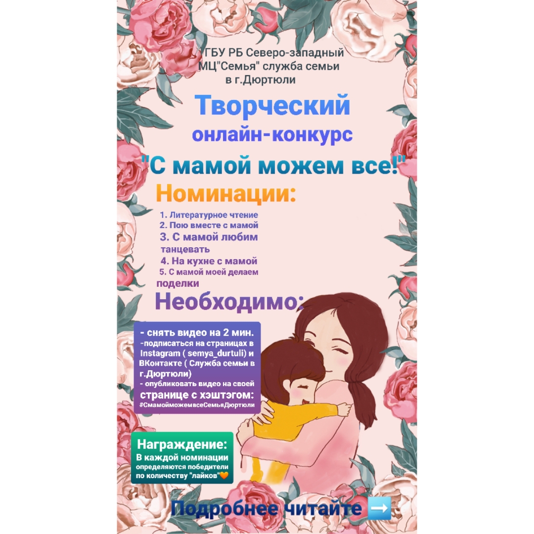 Конкурс "С мамой можем все!" проводится с 10-22 ноября 2021 г. Итоги конкурса будут подведены с 23-25 ноября 2021 г. и опубликованы В контакте и Instagram.