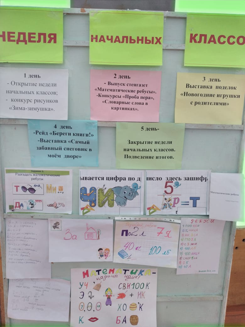 В течение недели проводились разные мероприятия по плану Недели. Учащиеся 1-4 -ых классов принимали активное участие в конкурсах рисунков "Зима-зимушка", "Новогодние поделки с родителями", "Математические ребусы".